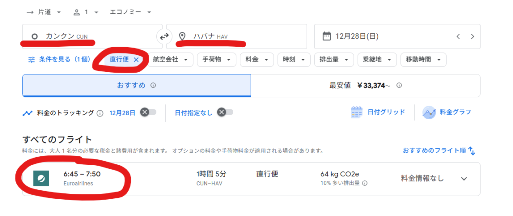 Googleフライトでカンクンーハバナの直行便を検索すると下記のような検索結果がヒットししました。