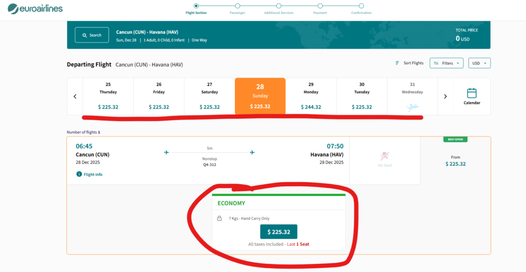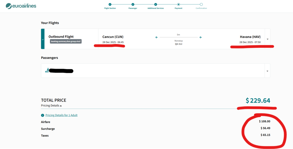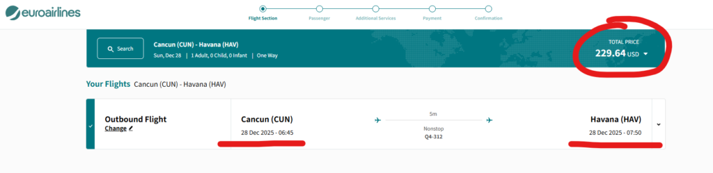 ちなみに、こちらの記事は、カンクンーハバナ間を 「Euroairlines(ユーロエアラインズ)」という航空会社サイトで購入している記事になりますが、より安い航空会社サイト(預入荷物込み)を最後に記載しています。そちらでの購入を強くオススメします。