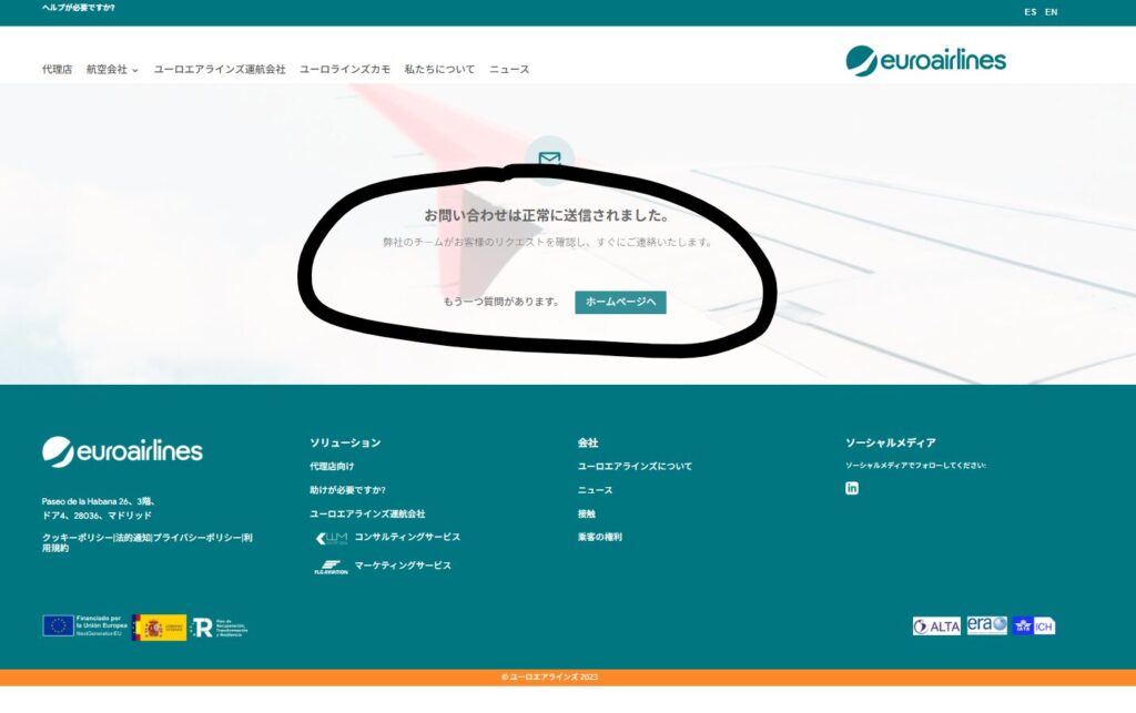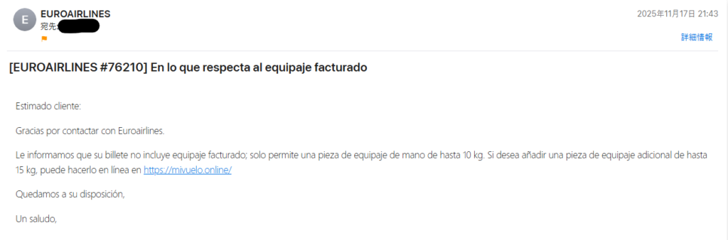 しかしながら、不安なので、直接Euroairlines(ユーロエアラインズ)に問い合わせをしてみました。