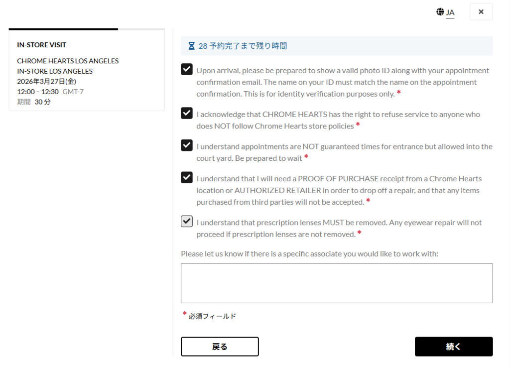 ご来場の際は、有効な写真付き身分証明書と予約確認メールをご提示ください。身分証明書の氏名は、予約確認メールに記載されている氏名と一致する必要があります。これは本人確認のみを目的としています。 Chrome Heartsは、Chrome Heartsの店舗ポリシーに従わないお客様へのサービス提供をお断りする権利を有することを承知しています。 ご予約いただいた場合、ご入場時間は保証されませんが、中庭へのご入場は可能です。お待ちいただく場合がございますのでご了承ください。 修理品をお預かりするには、Chrome Heartsの店舗または正規販売店からの購入証明書(レシート)が必要となります。また、第三者からご購入いただいた商品はお受けできません。 度付きレンズは必ず外していただく必要があります。度付きレンズが外されていない場合、眼鏡の修理は行えません。 ご希望のスタッフをお知らせください。