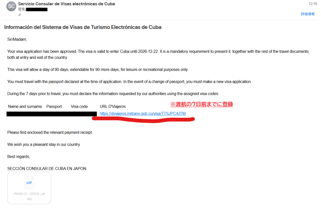 キューバのE-VISAを申請し、承認されると、下記のようなメールが届きます。