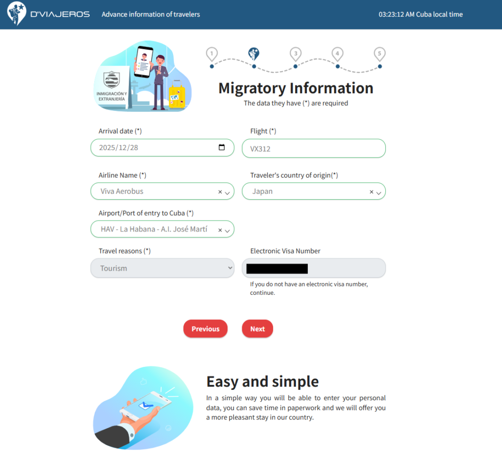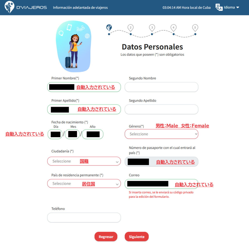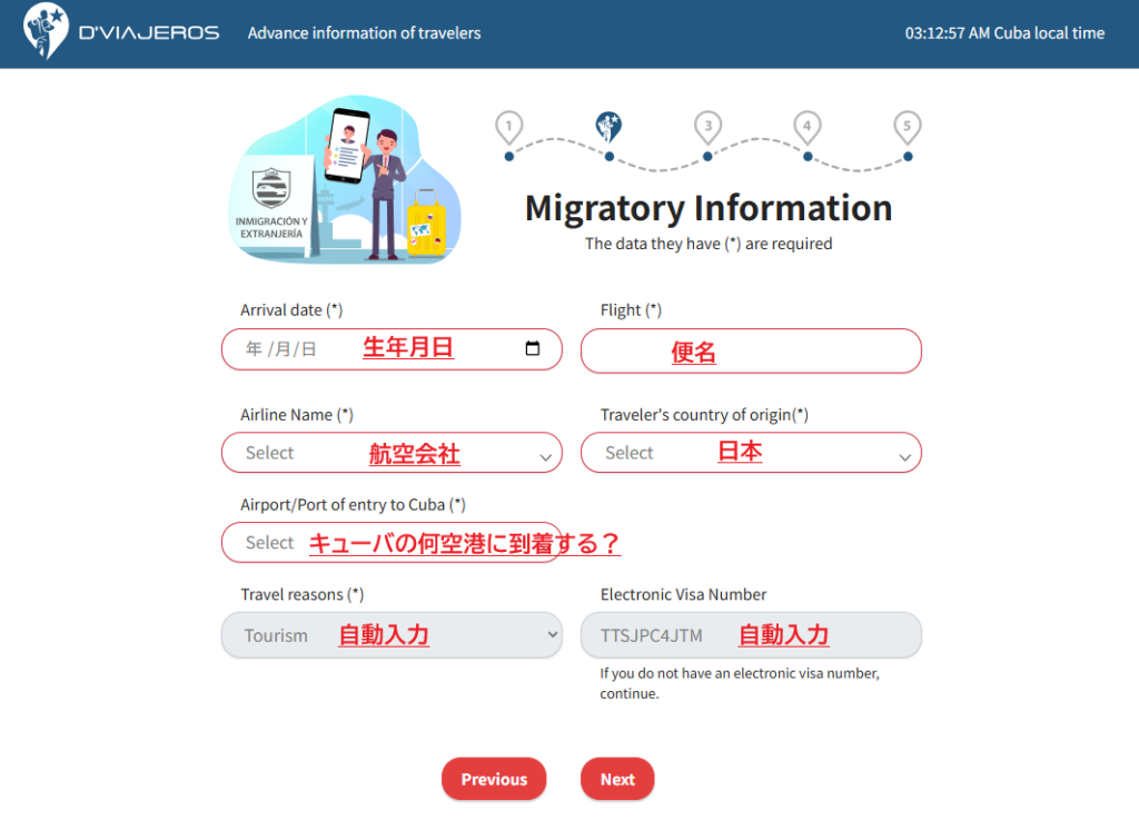 - 入力タイミング: キューバ行きのフライトのチェックインの最大48時間前から入力できます。