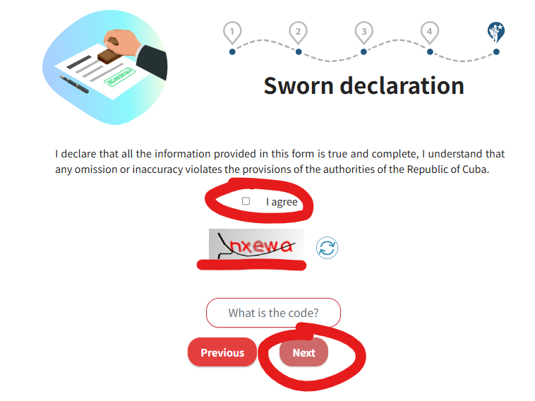 私はこのフォームに記入されたすべての情報が真実かつ完全であることを宣言します。また、いかなる省略または不正確な情報もキューバ共和国当局の規定に違反することを理解しています。