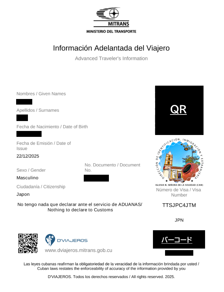 D’Viajero(D’Viajeros)とは、キューバへの入国時に必要な、出入国カード・税関申告書・健康状態申告書を統合したオンラインフォームで、入力後に発行されるQRコードの提示が義務付けられています。キューバへの入国手続きを迅速化するために導入され、航空機のチェックインの最大48時間前から入力可能で、家族全員(子供も含む)が1人ずつ入力する必要があります。