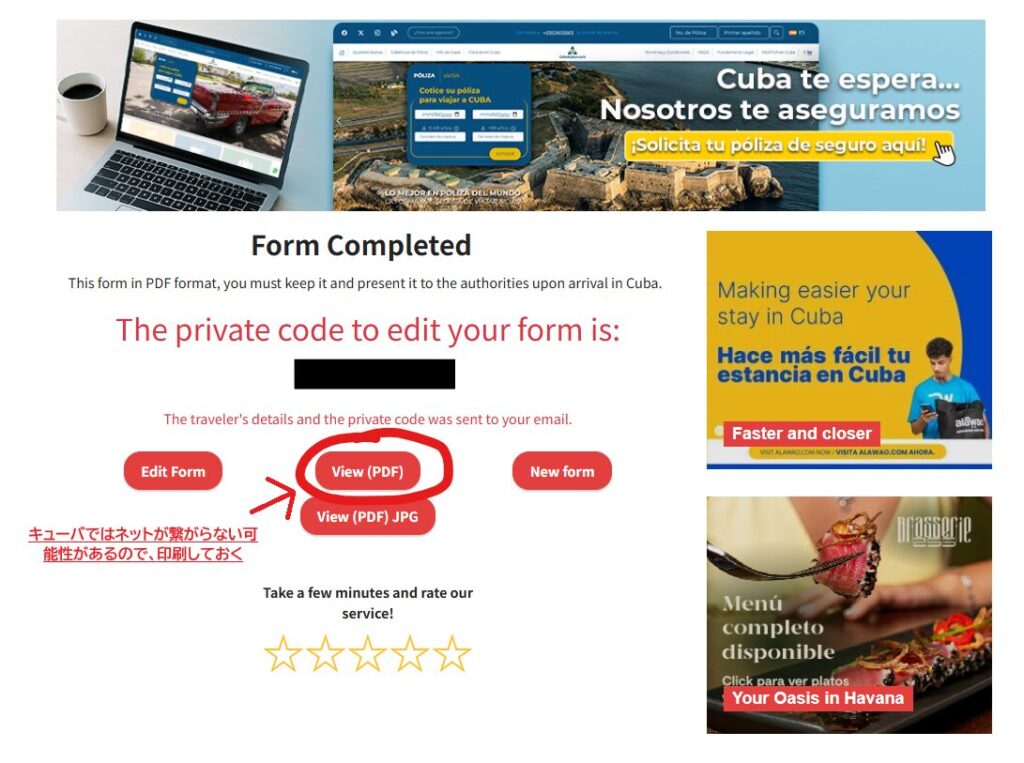 なぜなら、キューバの電波は最悪です。オンラインで画面が開けない可能性が大ですので、スクショで残しておくことをお勧めします。