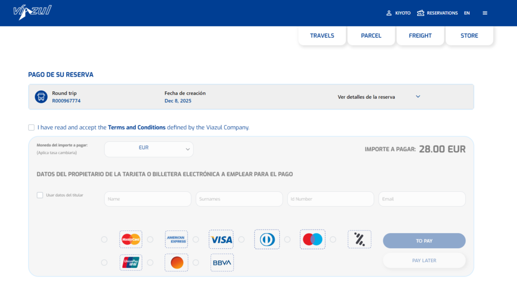 今回は往復なのでIda y vueltaを選択