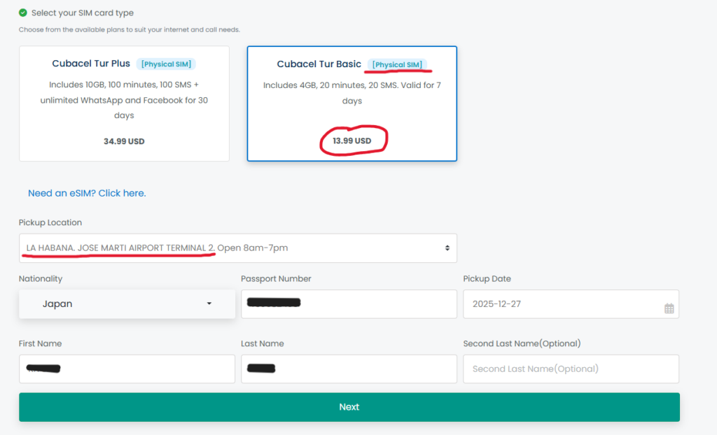 ・受け取り場所:到着空港のハバナ・ホセマルティ空港(ご自身の到着空港を選択しましょう)