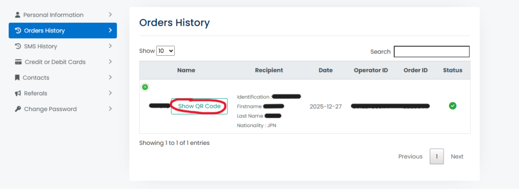 このようにオーダーが完了しています。赤丸部分のQRコードはスクリーンショットで保存しておきましょう