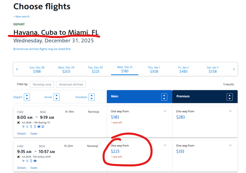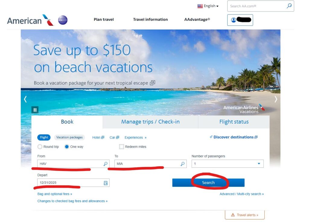 まずは、アメリカン航空のサイトへアクセスし、ハバナーマイアミ便を検索します。