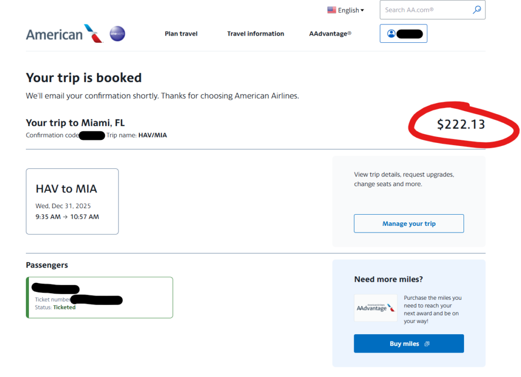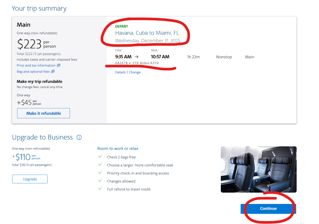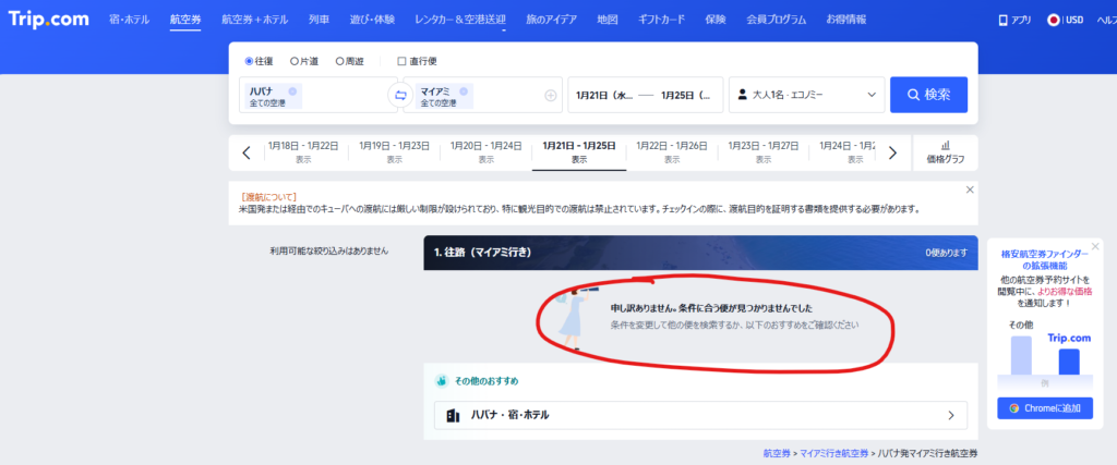 ちなみにTrip.comなどのサイトでは、キューバからアメリカ直行便のフライトは出てきませんので、直接アメリカの航空会社サイトにアクセスすることが必要です。