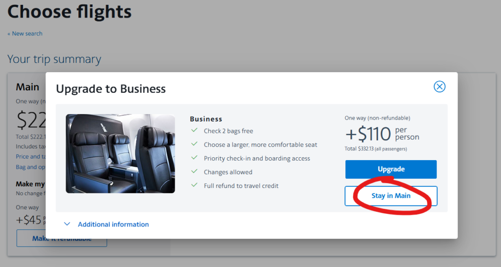 ビジネスへのアップデートは不要なので、そのままメインキャビンを選択