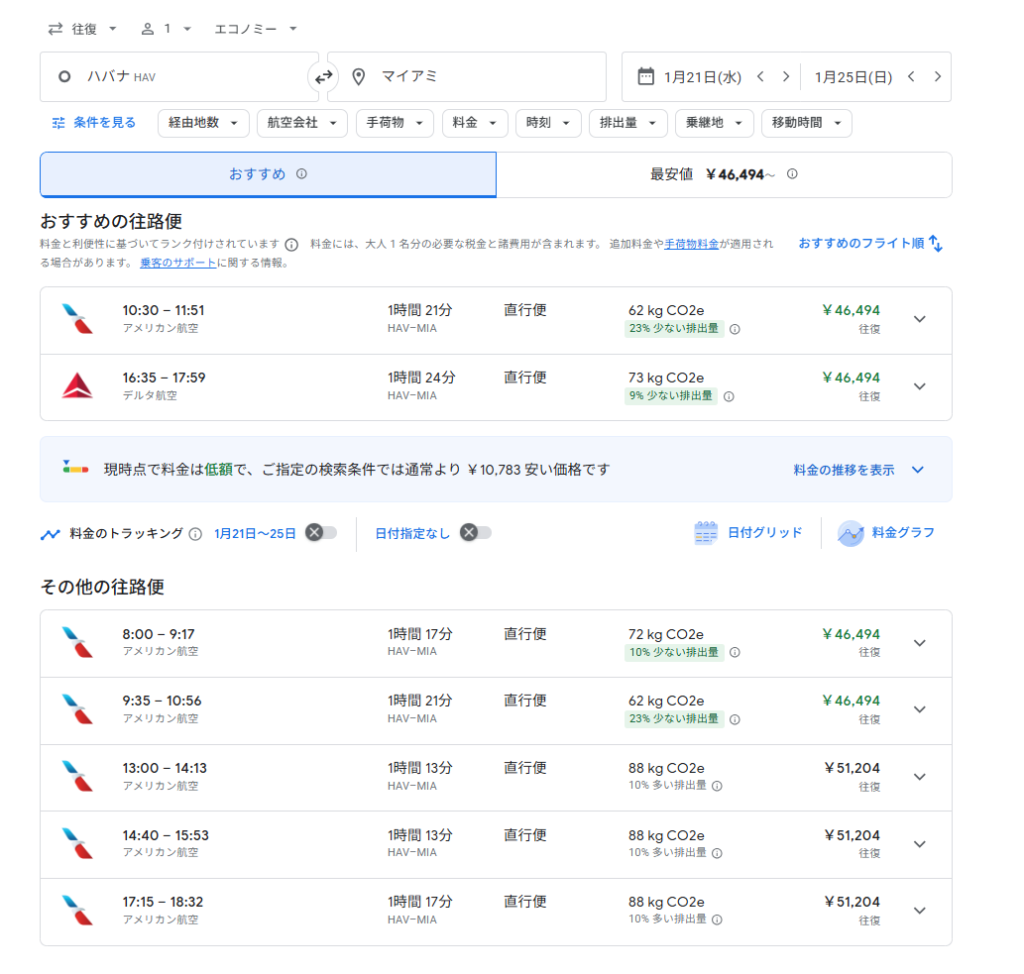 キューバから直接アメリカへの入国を検討している方は、Googleフライトで検索すると、直行便が出てきますので、安いチケットを確認して、直接航空会社のサイトで購入する方法がベストです。