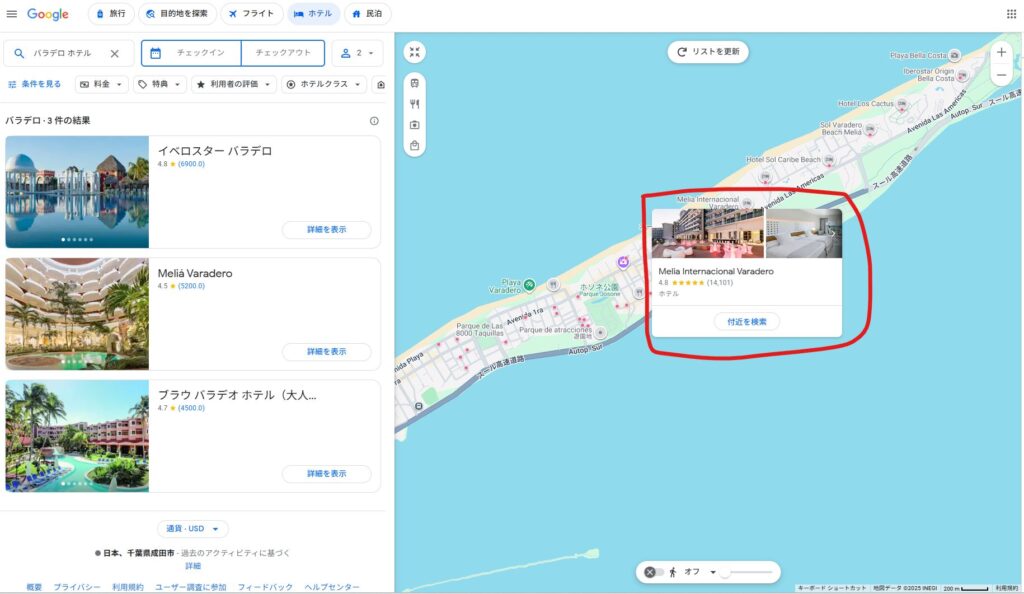 カーソルを当てると、ホテルの詳細が出てきます。