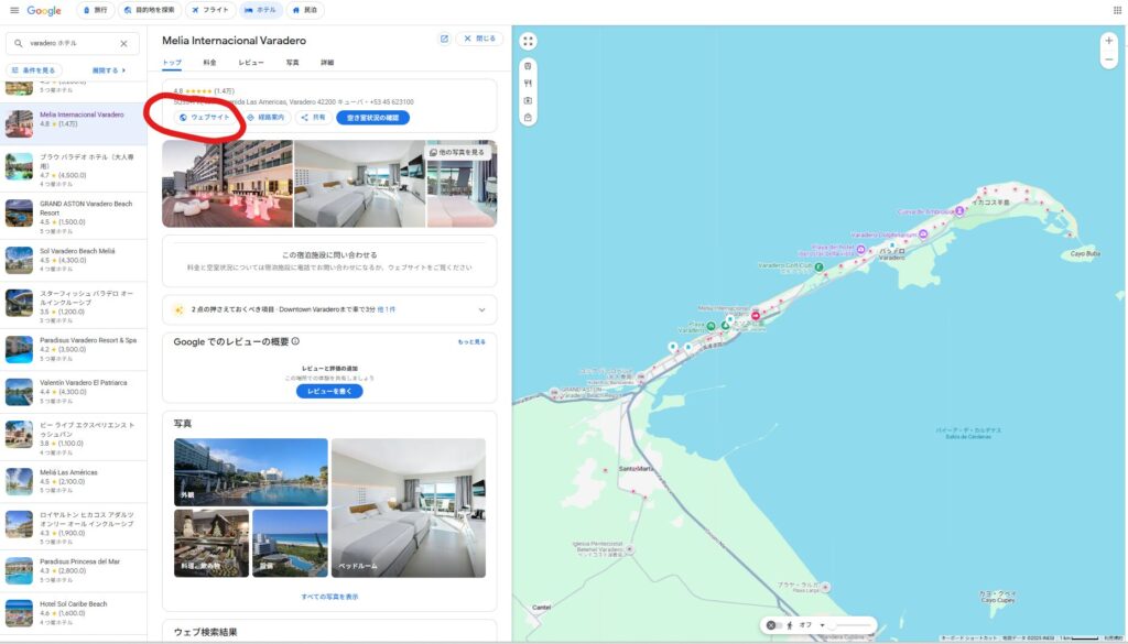 好みのホテルをチェックすると、Google上に「ウェブサイト」の項目が出てきます。