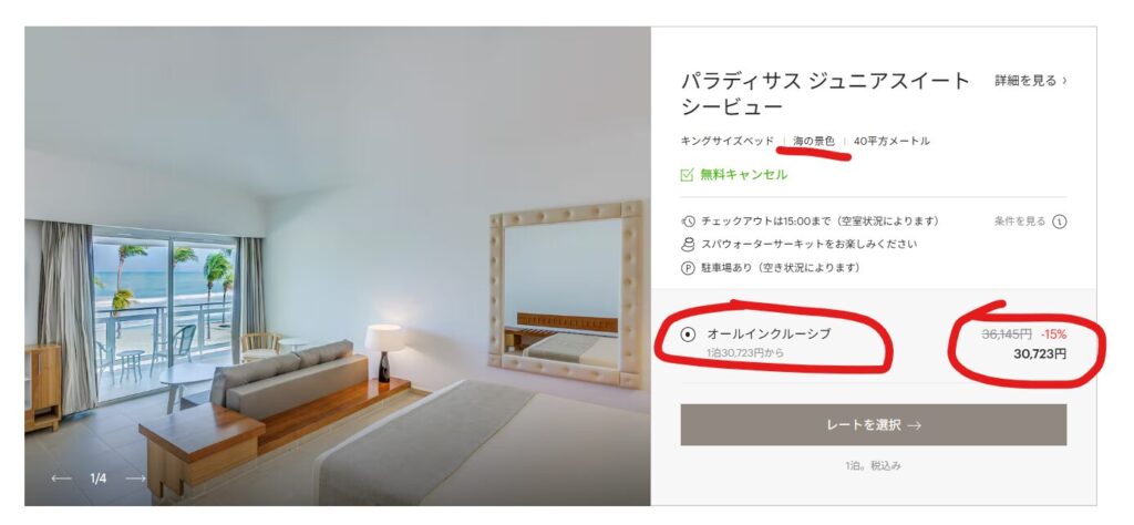 こちらは、オーシャンビューで30,723円/泊です。