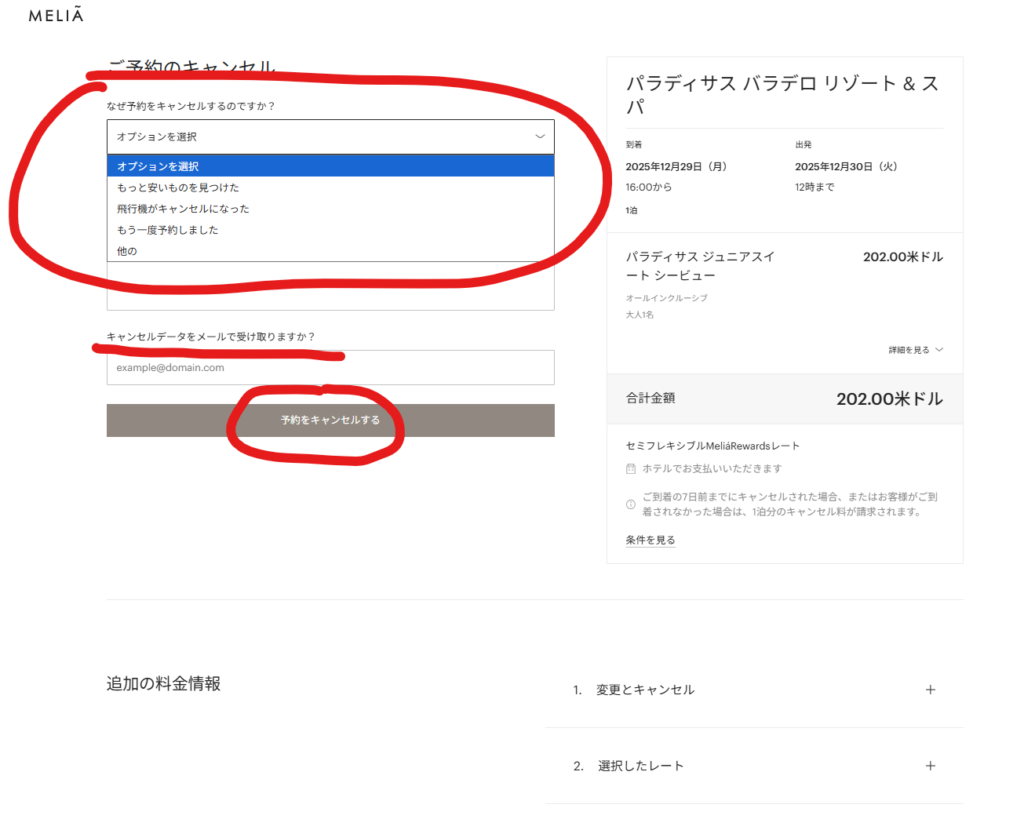キャンセル理由の項目を選択する画面がでてきますので、選択して「予約をキャンセルする」ボタンをクリックすると、キャンセルできます。