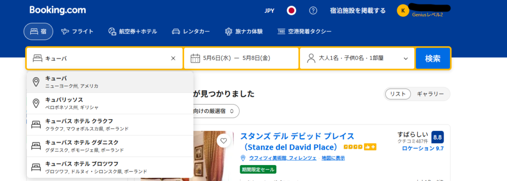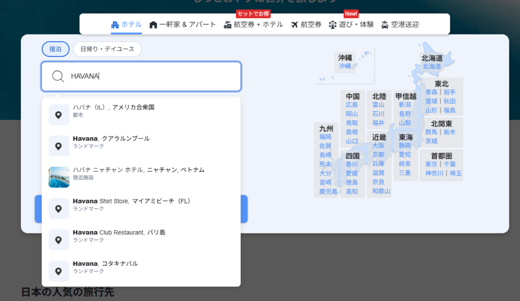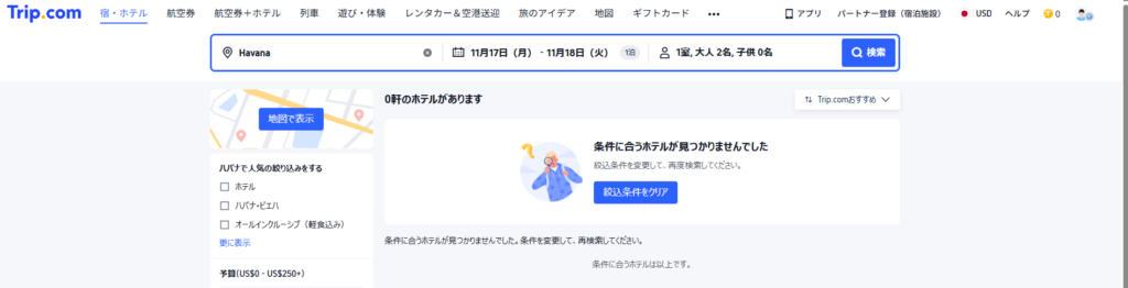 下記のように、大手旅行サイト「Booking.com」「Agoda」「Trip.com」でキューバの首都ハバナを検索すると、ハバナという地名は出てきますが、キューバではないハバナがヒットします。